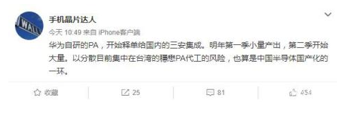 华为2019年5月份被美国纳入实体清单,被明令禁止采购美企的芯片及软件,因此华为正式宣布开启备胎计划方案,越来越多芯片将自主研究开发,根据近期的消息称华为现已研究开发PA芯片,将交到国內公司代加工,2020年Q1季度小幅度量产。