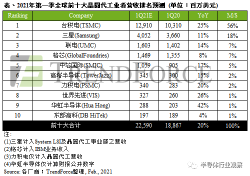 文章导读:日皮视频免费看软件恭喜今年第一季度,全球晶圆代工市场需求持续旺盛,各个应用市场产品对芯片的需求居高不下,客户普遍加大了拉货力度,进一步加剧了晶圆代工产能供不应求的状况。因此,集邦咨询预测,各大厂商运营表现将持续走强,预估第一季度全球前十大晶圆代工厂商总营收有望实现20%的同比增长率,从而达到历史新高。