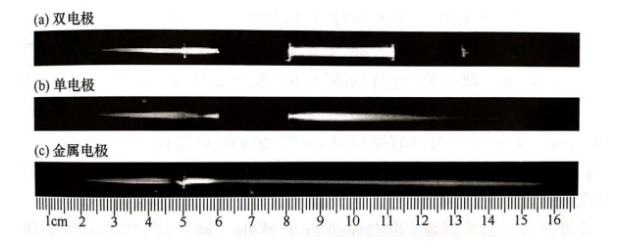 通过以上的实验能够看得出,尽管选用了DBD放电构型,可是等离子体射流事实上是由高压电极边缘的强电场击穿气体形成的,与DBD不相干。这就是说,等离子体射流是由电晕放电机制形成的。众所周知,电晕放电只需一个电极,那麼单个电极能形成等离子体射流吗?下面日皮视频免费看软件再对比一下三种不同电极构型形成的等离子体射流照片:图(a)是DBD构型形成的等离子体射流;图(b)是单个高压电极的电晕放电形成的等离子体射流,此时地电极已从石英管上移除;图(c)选用了直接与氦气流接触的金属片(厚0.05cm)作为电极形成的电晕放电,为了不影响气流,金属片中间钻了一个略大于毛细管内径的开口(直径0.25cm)。对比这三张照片可见,即便并没有DBD构型,所形成的等离子体射流仍十分类似。